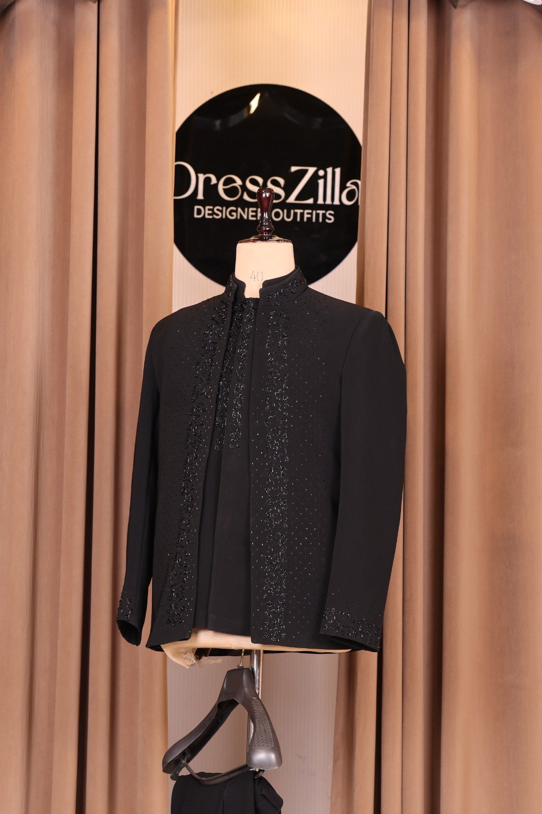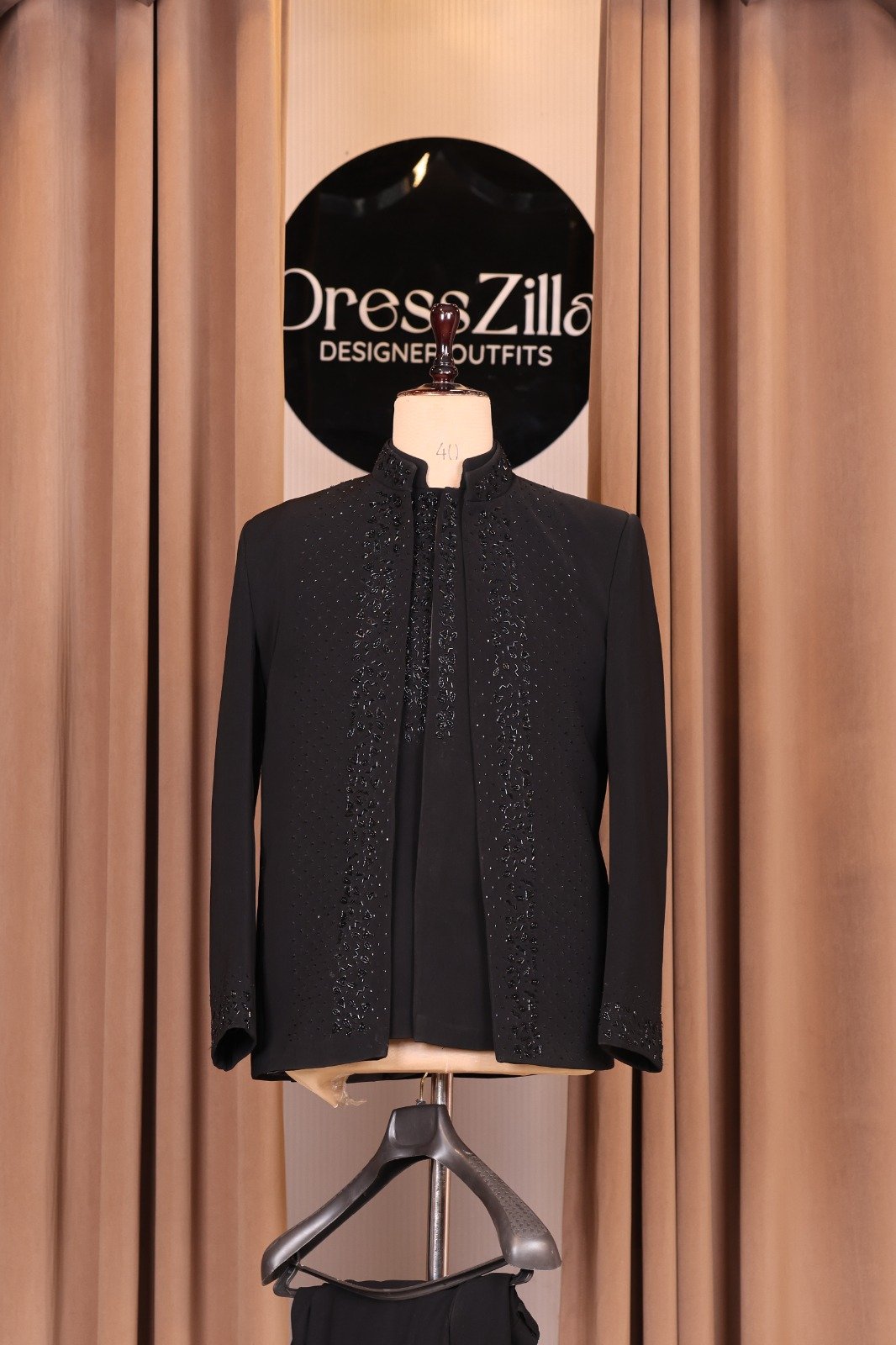 & Free ShippingEmbrace the mystery of the night with the Stardust Onyx Jodhpuri. This ensemble is a masterclass in tonal texture, featuring a layered open-jacket design that combines sharp tailoring with a “shimmer-from-within” effect. It is a sophisticated choice for the modern man who values minimalist elegance and high-end detail.
