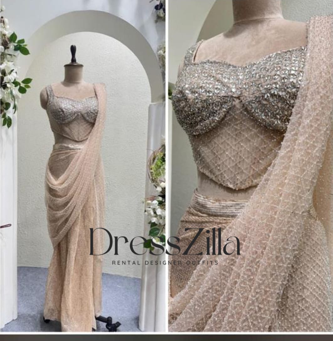 & Free ShippingThis glamorous Golden Corset Saree from Dress Zilla is a showstopper, designed for those who desire modern elegance with a touch of sparkle. The outfit features a beautifully crafted corset blouse, encrusted with shimmering embellishments, which adds a sculpted and stylish silhouette. Paired with a delicately netted saree in a subtle gold tone, it drapes effortlessly to enhance your curves and offer a graceful, contemporary look. Perfect for special occasions and evening events, this saree promises to make you the center of attention with its chic design and luxurious finish.