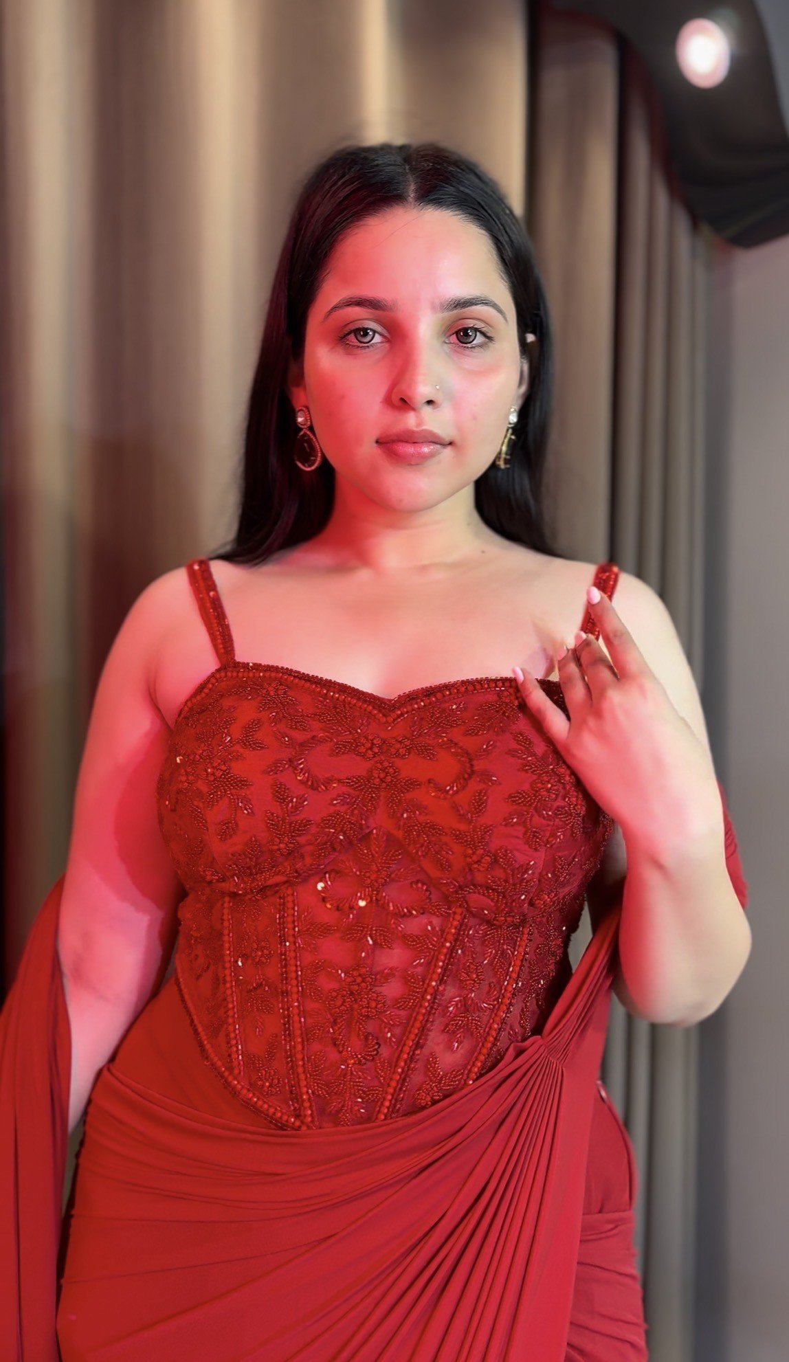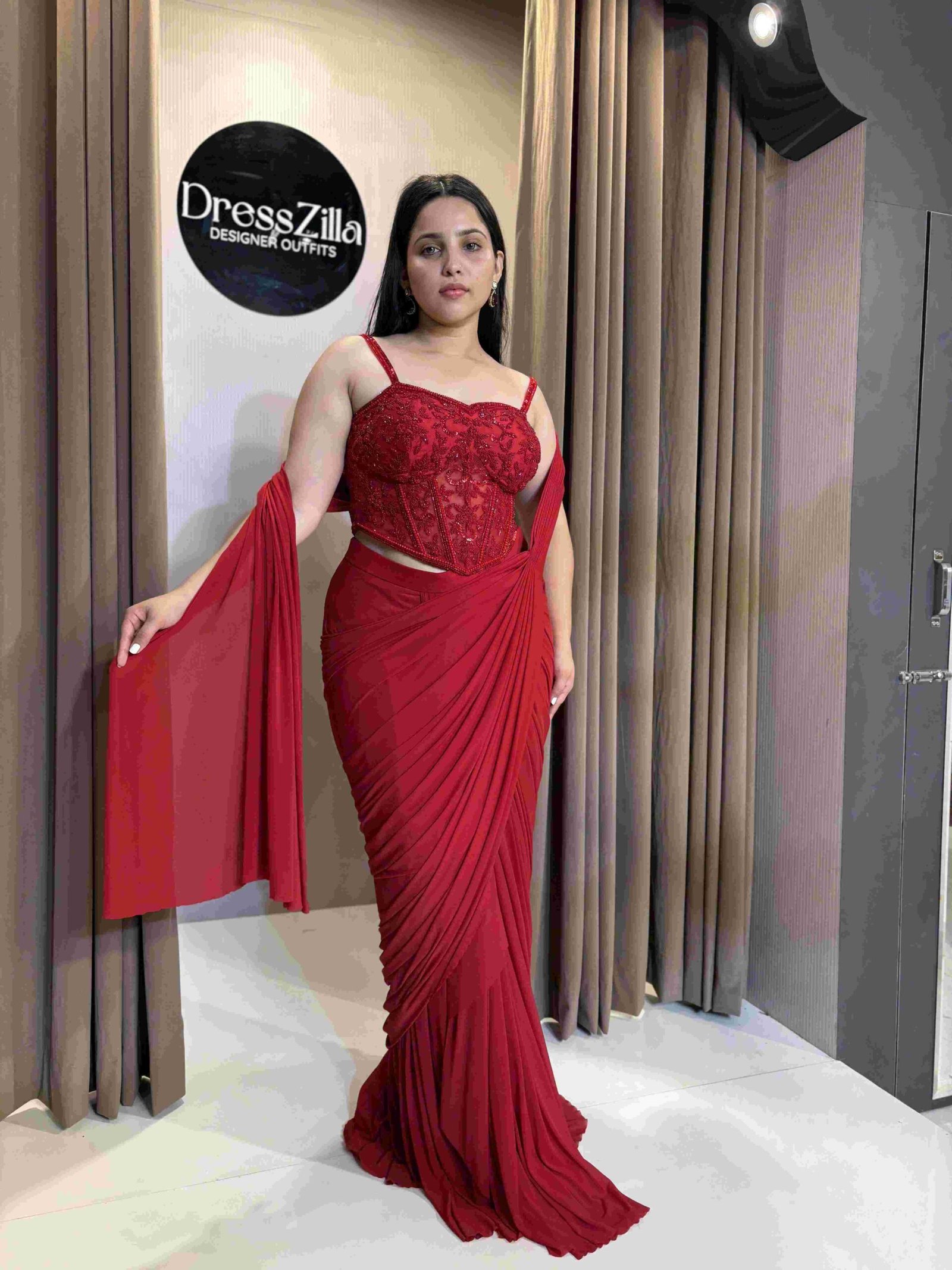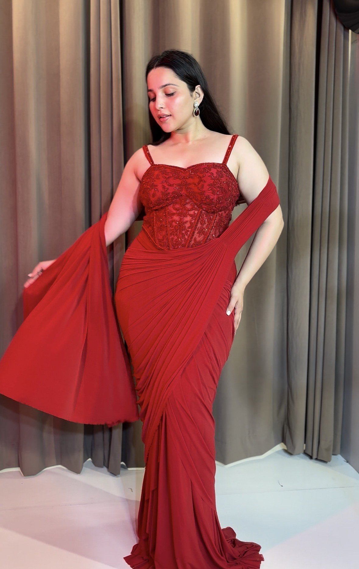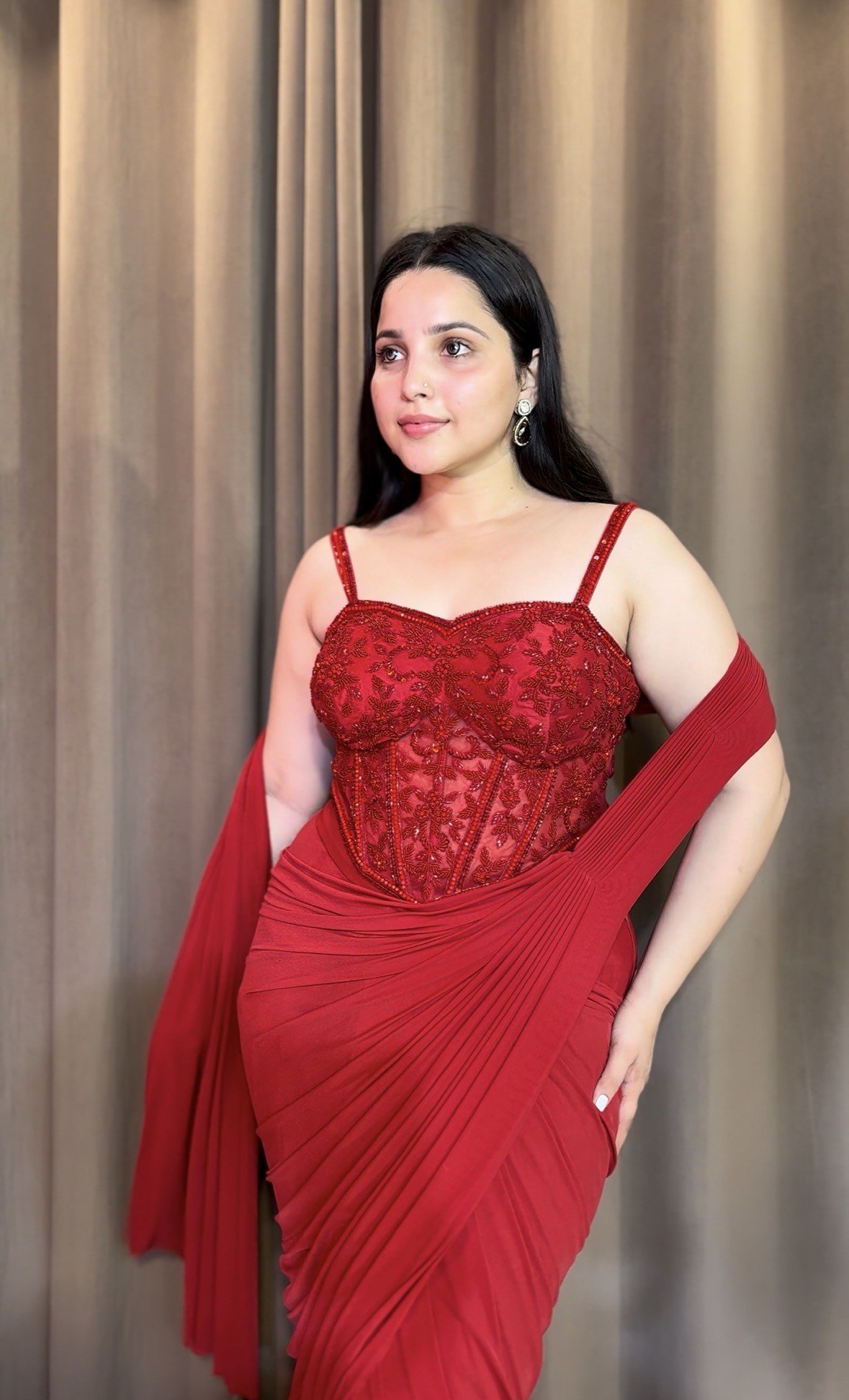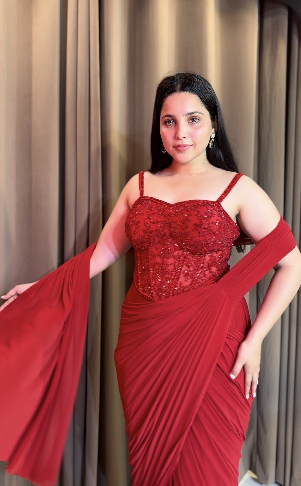 A radiant red drape woven in grace and modern allure.